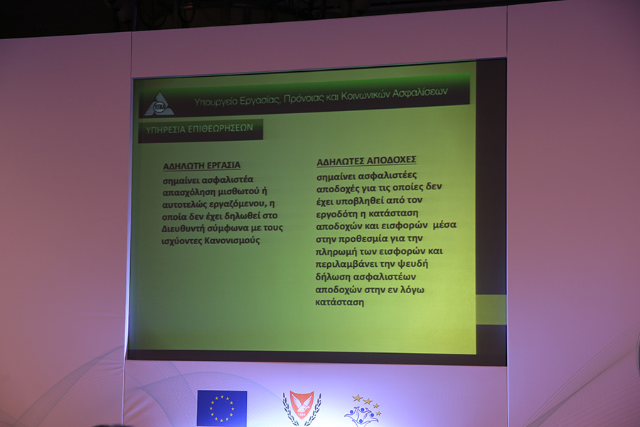 Κατά το δεύτερο μέρος της συνάντησης, παρουσιάστηκε η Σύσταση και Λειτουργία της Ενιαίας Υπηρεσίας Επιθεωρήσεων του Υπουργείου Εργασίας, Πρόνοιας και Κοινωνικών Ασφαλίσεων από τον κ. Άντη Αποστόλου, Προϊστάμενο της Υπηρεσίας Επιθεωρήσεων.