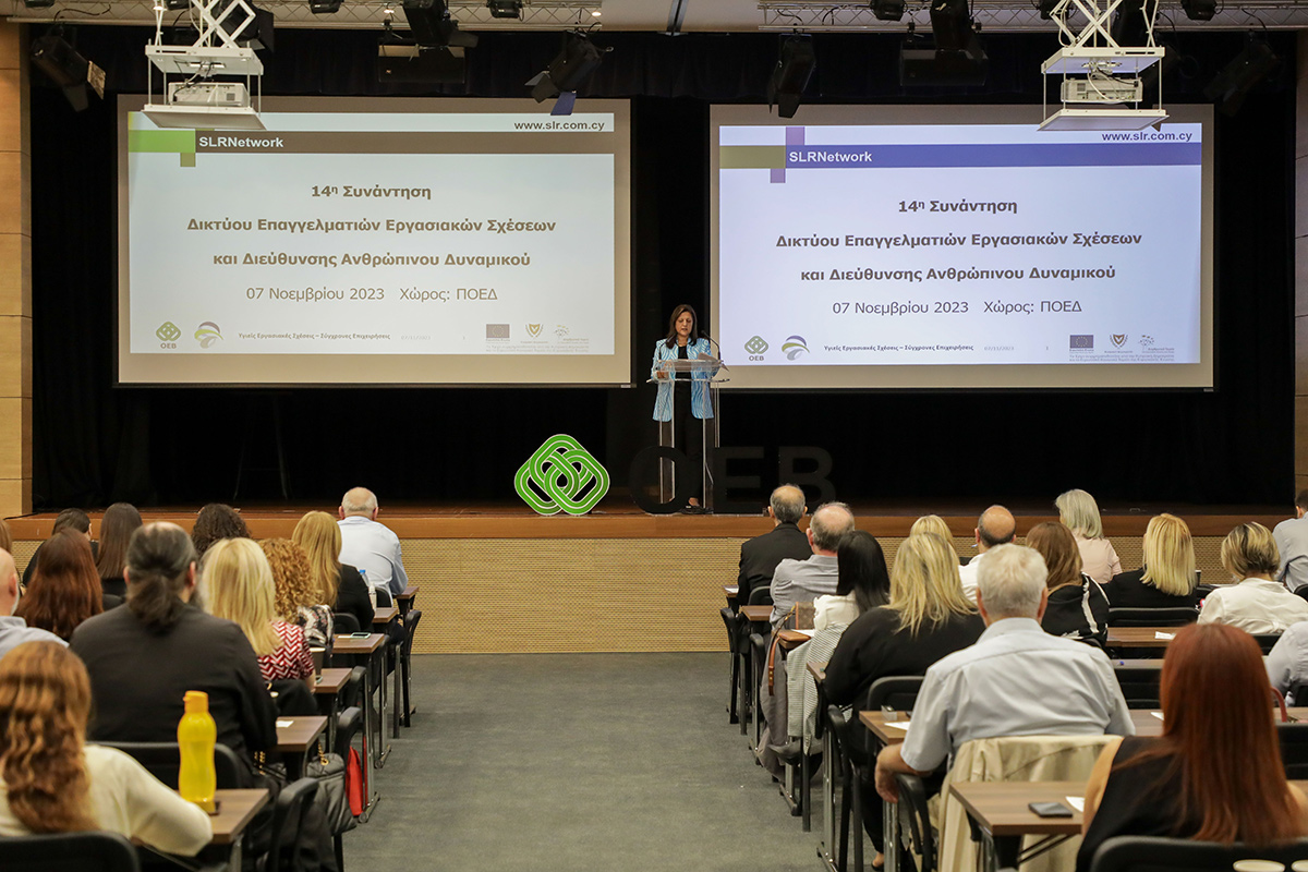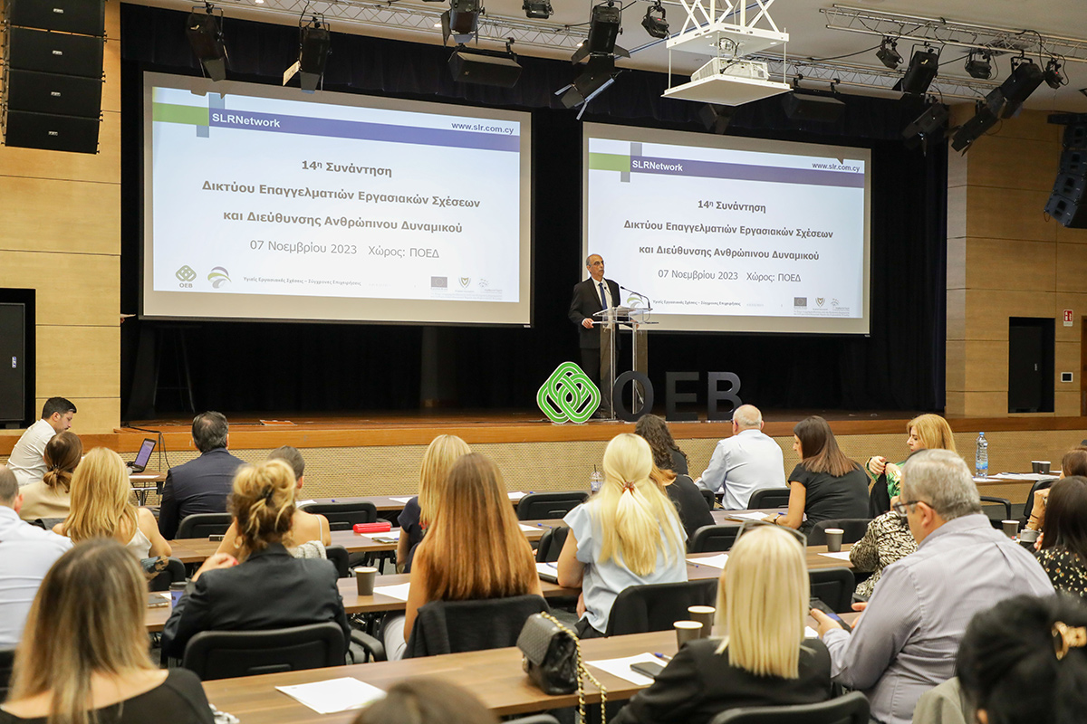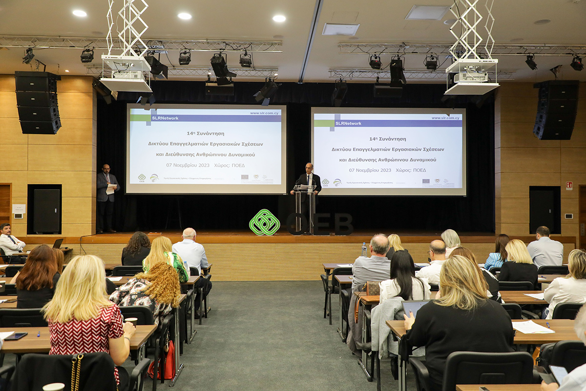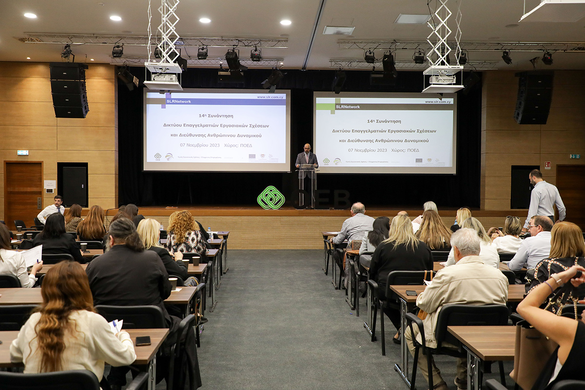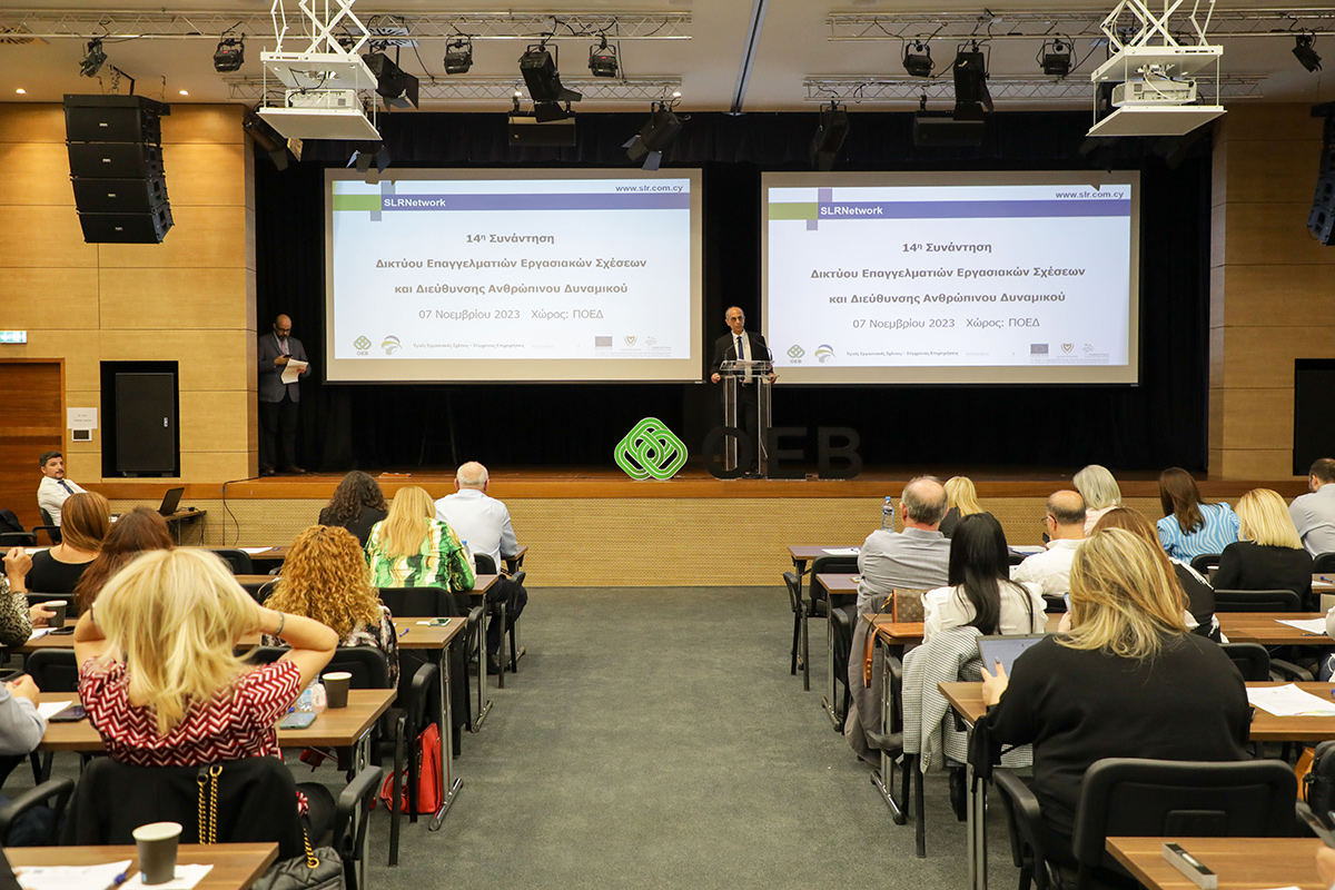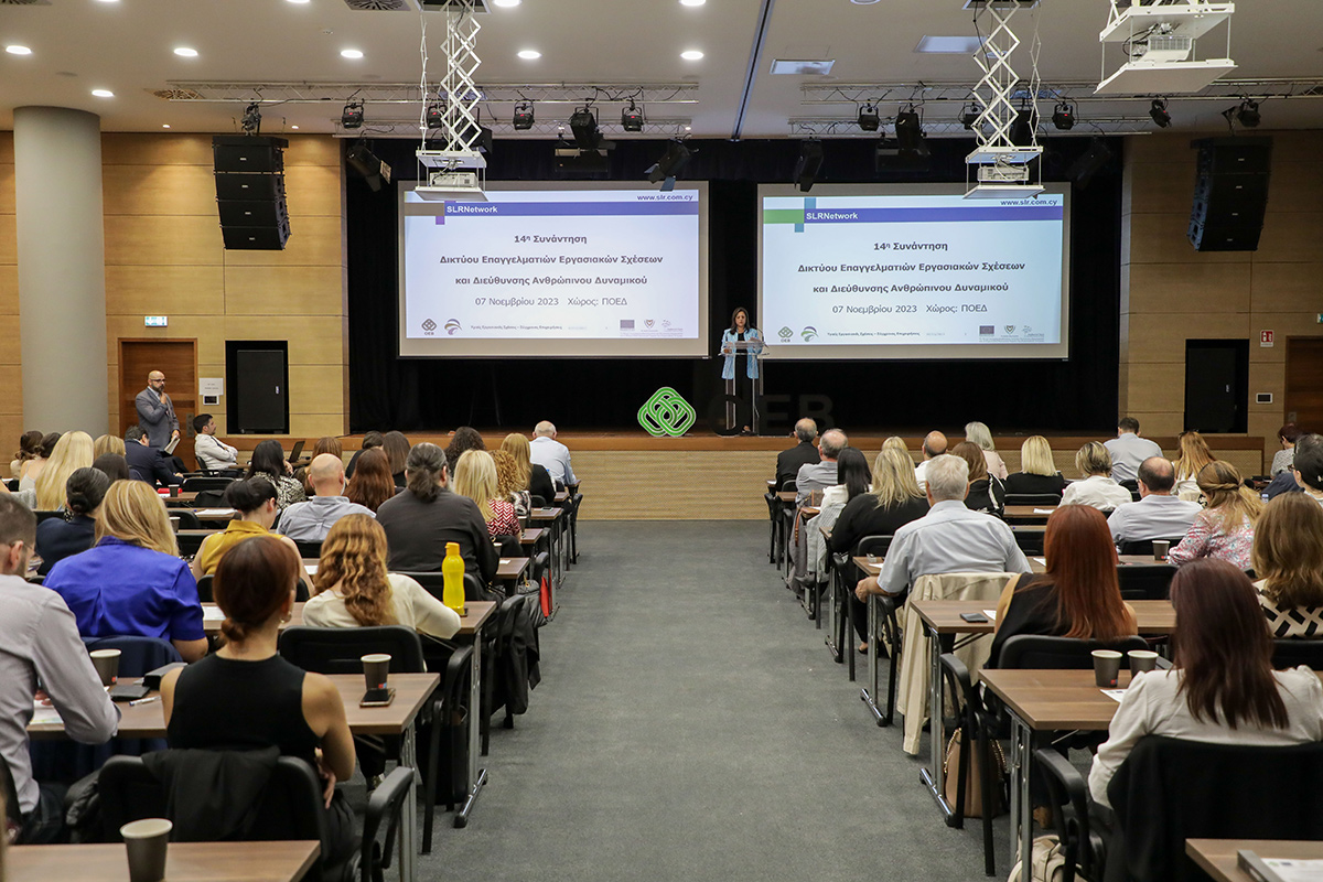 Η εκδήλωση ολοκλήρωσης του συγχρηματοδοτούμενου έργου από την Κυπριακή Δημοκρατία και το Ευρωπαϊκό Κοινωνικό Ταμείο της Ε.Ε. με τίτλο «Υγιείς Εργασιακές Σχέσεις, Σύγχρονες Επιχειρήσεις – Φάση Β» καθώς και η 14η συνάντηση του Δικτύου Επαγγελματιών στον Τομέα Εργασιακών Σχέσεων και Διεύθυνσης Ανθρώπινου Δυναμικού (SLRNetwork) πραγματοποιήθηκε την Τρίτη, 7 Νοεμβρίου 2023 στην παρουσία 150 στελεχών επιχειρήσεων. Κατά τη συνάντηση έγιναν παρουσιάσεις για σημαντικά θέματα εργασιακού ενδιαφέροντος και οι συμμετέχοντες είχαν την ευκαιρία να υποβάλουν τα ερωτήματά τους και να ανταλλάξουν απόψεις με τους ομιλητές.