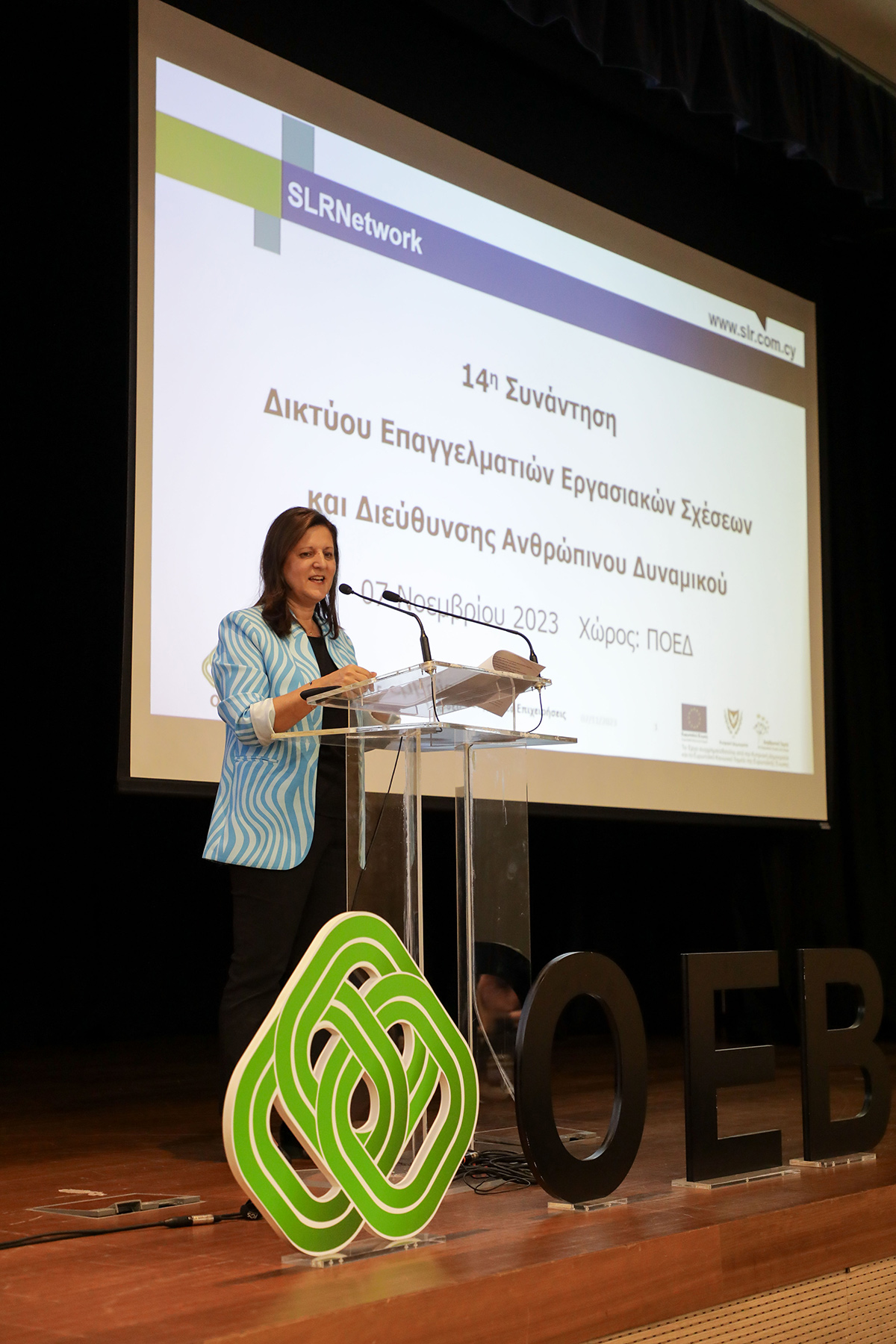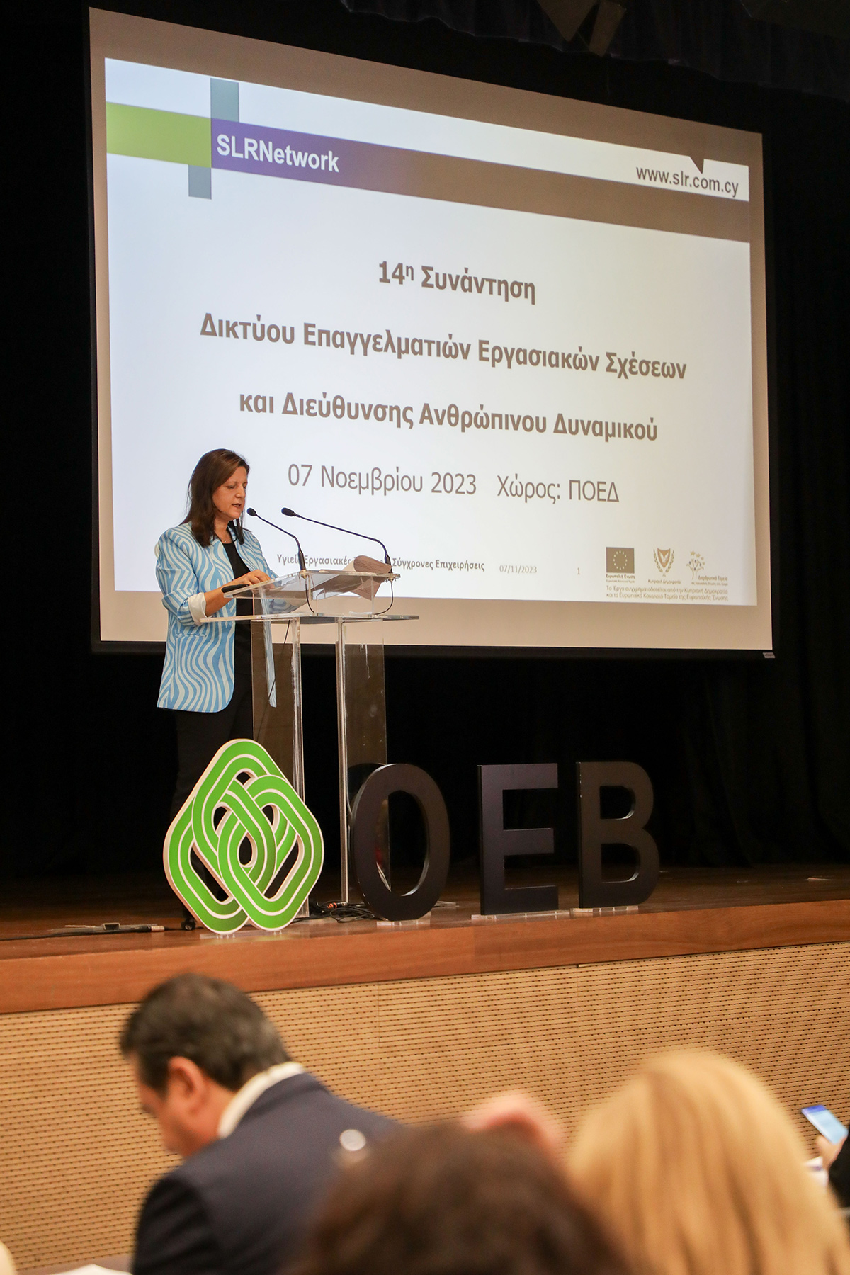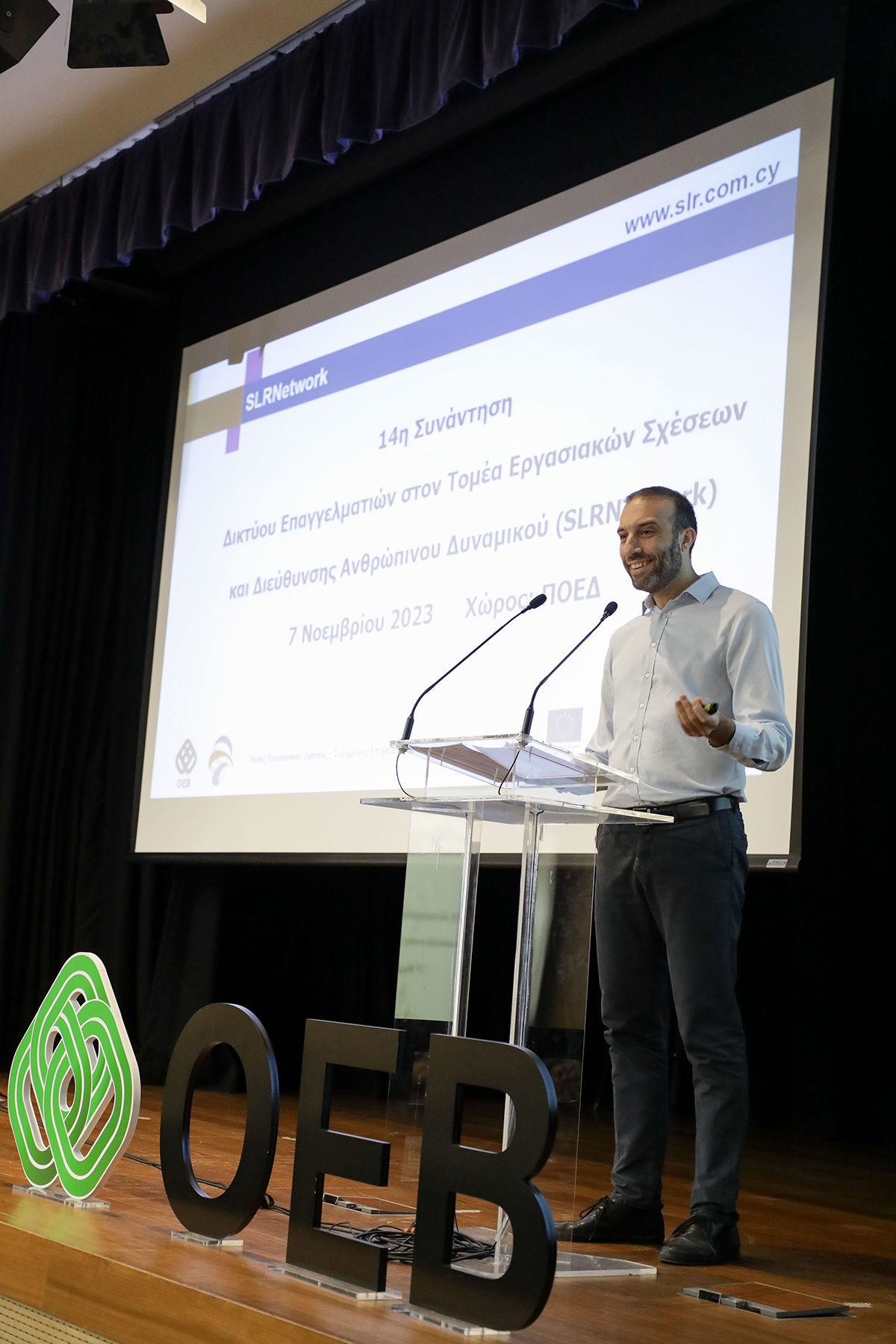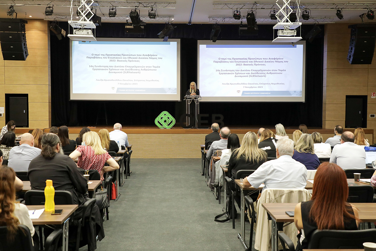 Η εκδήλωση ολοκλήρωσης του συγχρηματοδοτούμενου έργου από την Κυπριακή Δημοκρατία και το Ευρωπαϊκό Κοινωνικό Ταμείο της Ε.Ε. με τίτλο «Υγιείς Εργασιακές Σχέσεις, Σύγχρονες Επιχειρήσεις – Φάση Β» καθώς και η 14η συνάντηση του Δικτύου Επαγγελματιών στον Τομέα Εργασιακών Σχέσεων και Διεύθυνσης Ανθρώπινου Δυναμικού (SLRNetwork) πραγματοποιήθηκε την Τρίτη, 7 Νοεμβρίου 2023 στην παρουσία 150 στελεχών επιχειρήσεων. Κατά τη συνάντηση έγιναν παρουσιάσεις για σημαντικά θέματα εργασιακού ενδιαφέροντος και οι συμμετέχοντες είχαν την ευκαιρία να υποβάλουν τα ερωτήματά τους και να ανταλλάξουν απόψεις με τους ομιλητές.
