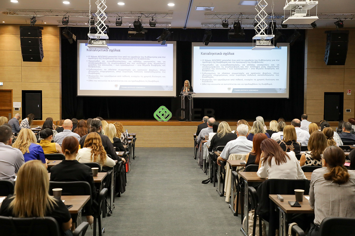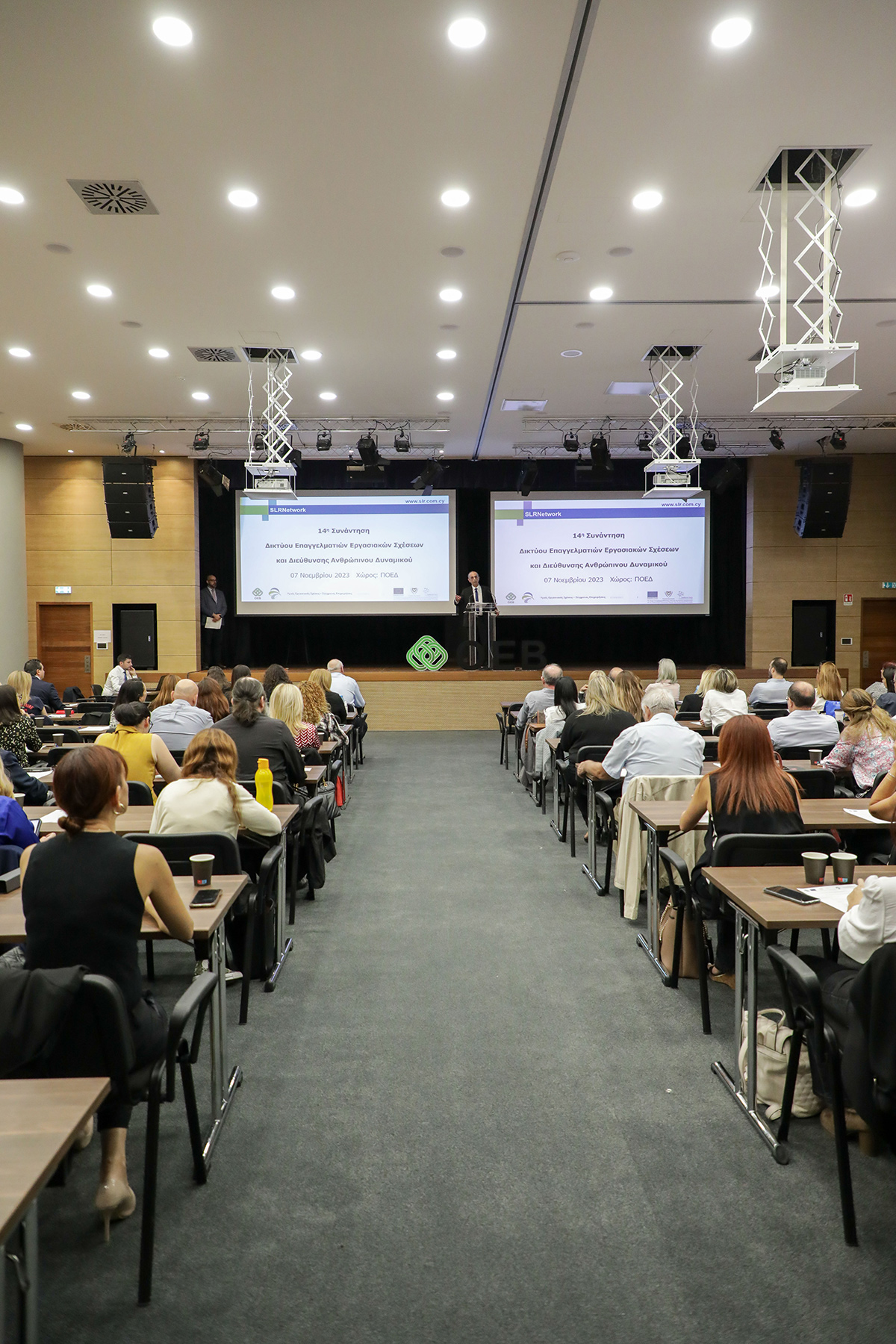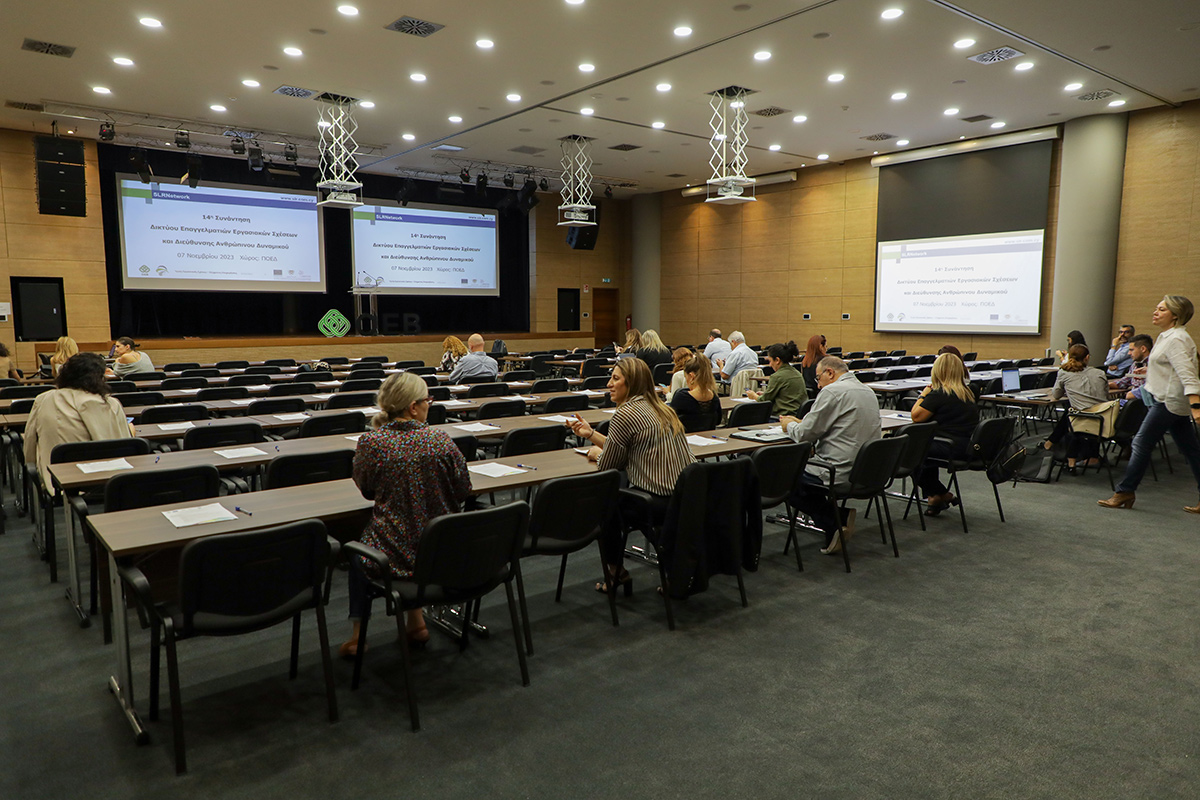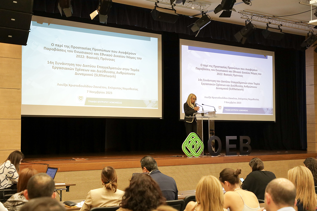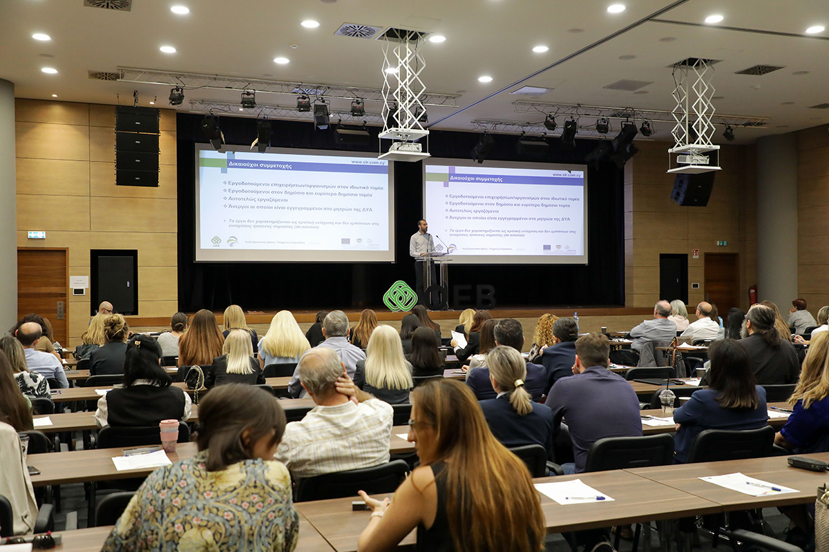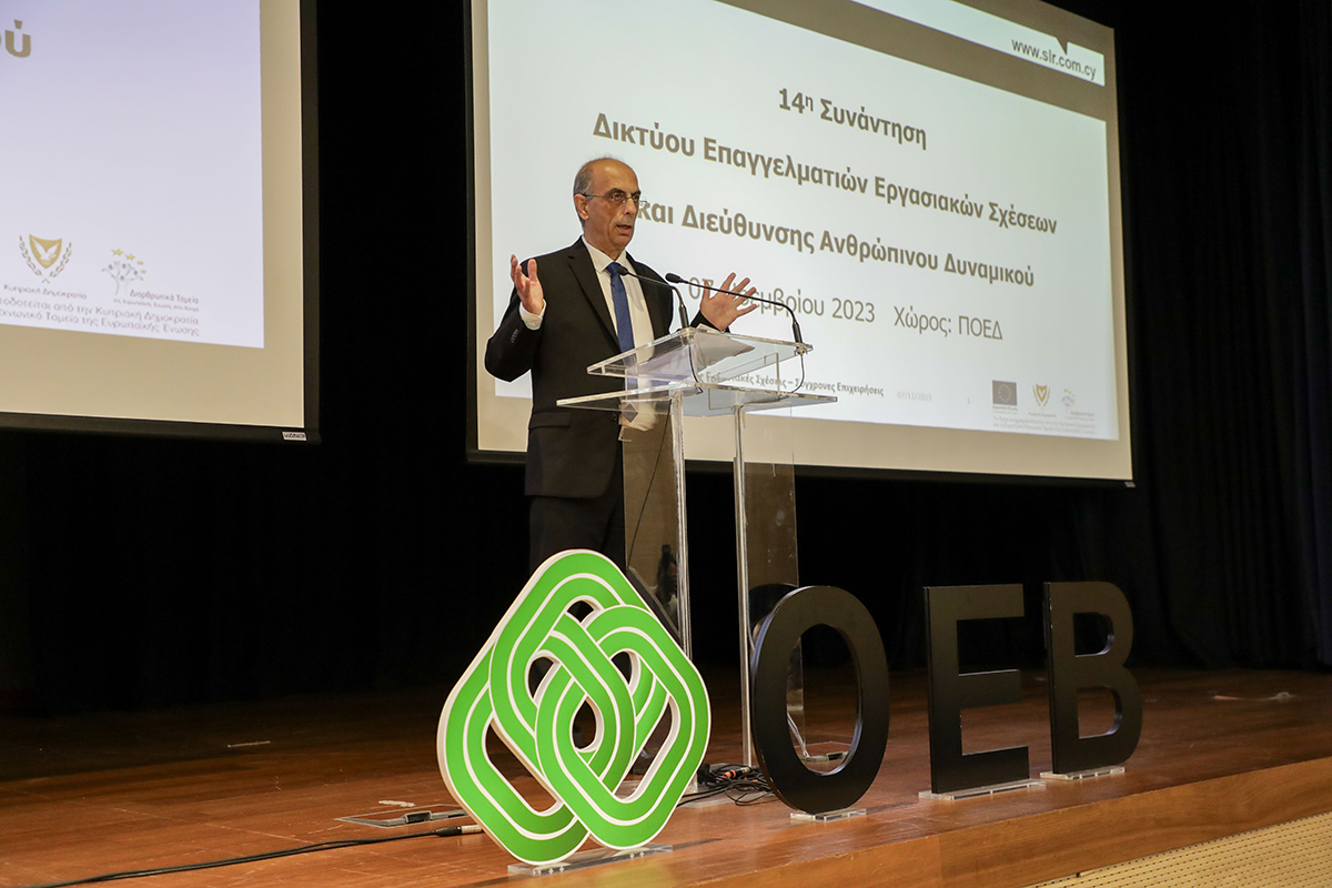 Η εκδήλωση ολοκλήρωσης του συγχρηματοδοτούμενου έργου από την Κυπριακή Δημοκρατία και το Ευρωπαϊκό Κοινωνικό Ταμείο της Ε.Ε. με τίτλο «Υγιείς Εργασιακές Σχέσεις, Σύγχρονες Επιχειρήσεις – Φάση Β» καθώς και η 14η συνάντηση του Δικτύου Επαγγελματιών στον Τομέα Εργασιακών Σχέσεων και Διεύθυνσης Ανθρώπινου Δυναμικού (SLRNetwork) πραγματοποιήθηκε την Τρίτη, 7 Νοεμβρίου 2023 στην παρουσία 150 στελεχών επιχειρήσεων. Κατά τη συνάντηση έγιναν παρουσιάσεις για σημαντικά θέματα εργασιακού ενδιαφέροντος και οι συμμετέχοντες είχαν την ευκαιρία να υποβάλουν τα ερωτήματά τους και να ανταλλάξουν απόψεις με τους ομιλητές.