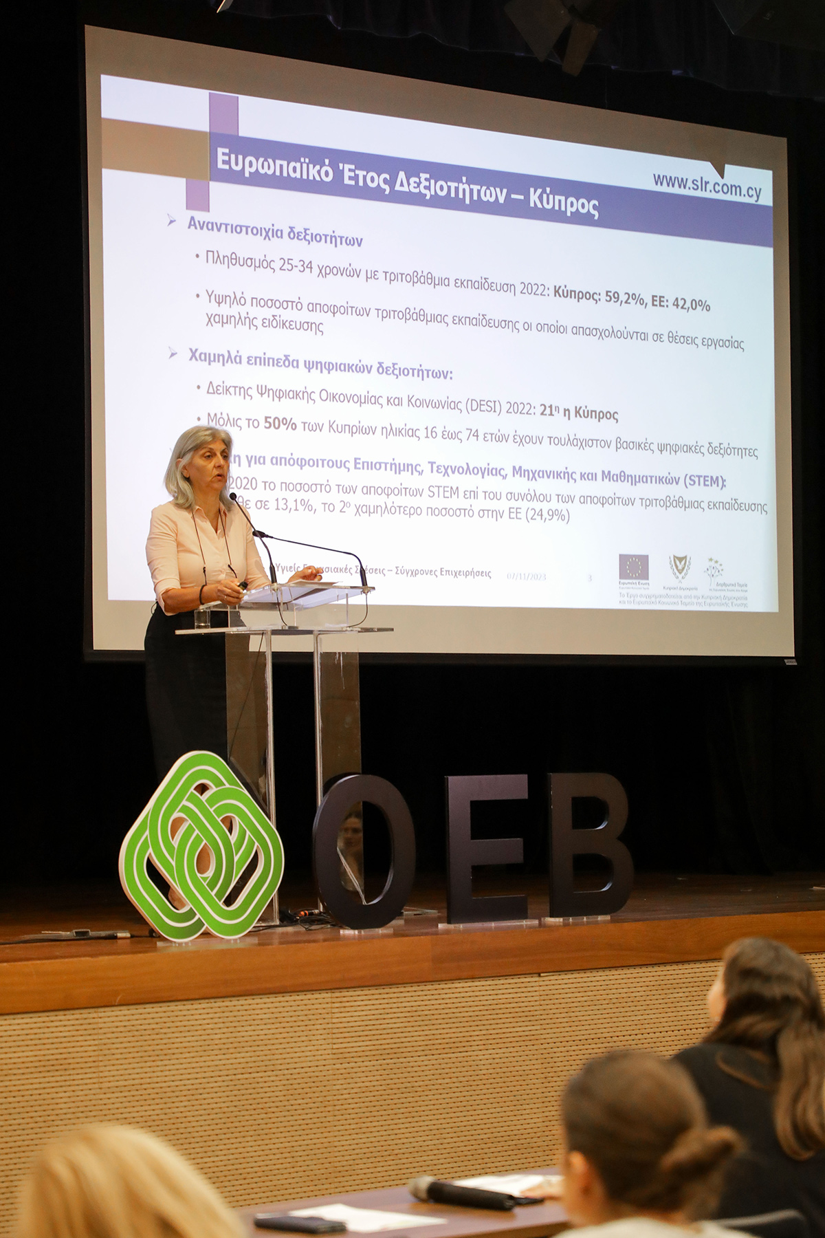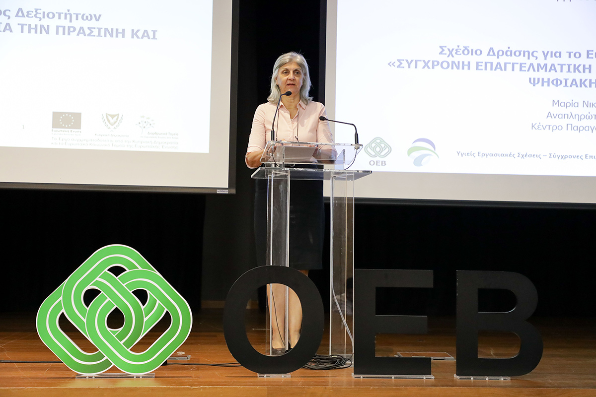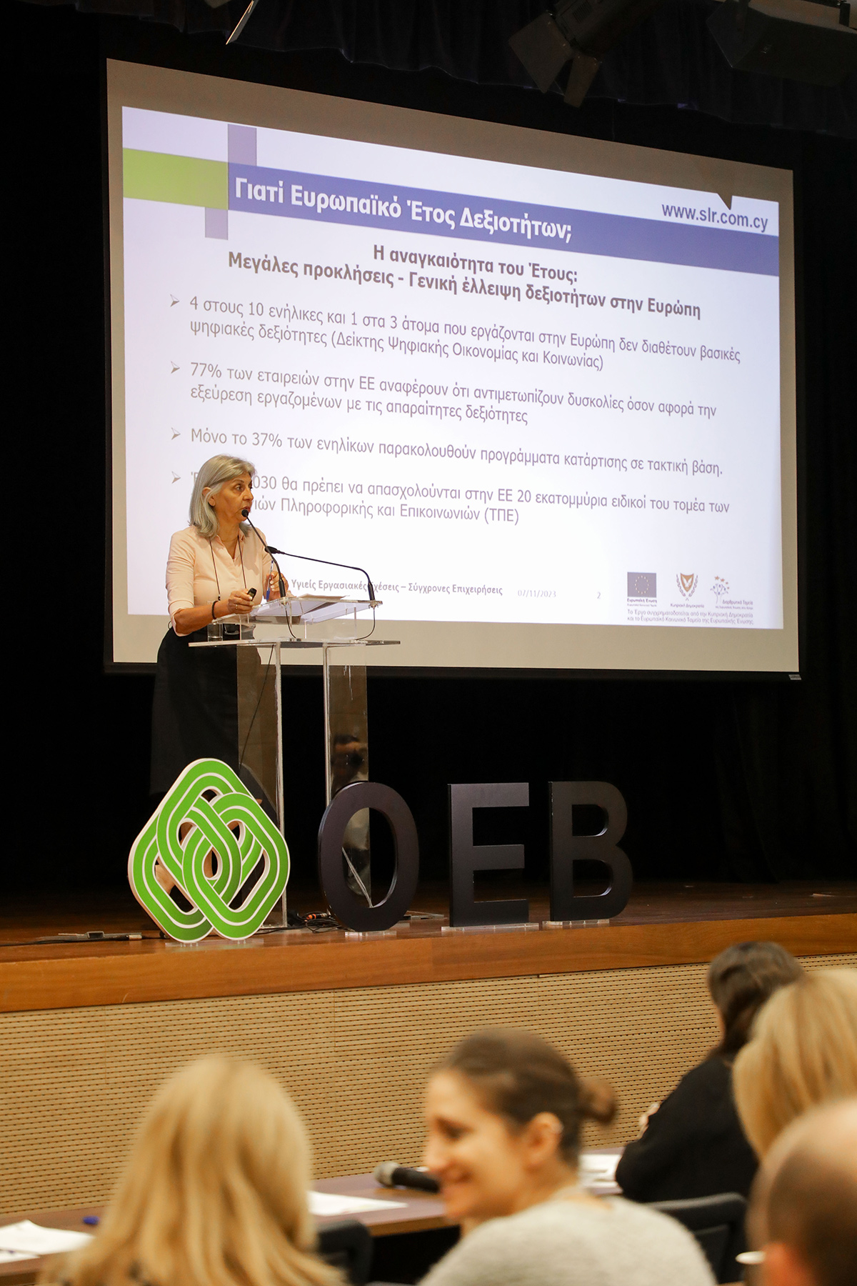 Στη συνέχεια, ακολούθησε χαιρετισμός από την Αναπληρώτρια Προϊστάμενη της Μονάδας Ευρωπαϊκού Κοινωνικού Ταμείου του Υπουργείου Εργασίας και Κοινωνικών Ασφαλίσεων η οποία εξέφρασε την εκτίμηση της προς την ηγεσία της ΟΕΒ για τον πρωταγωνιστικό της ρόλο στην υλοποίηση του έργου, καθώς και για την αξιέπαινη προσπάθεια της να στηρίξει τις κυπριακές επιχειρήσεις. Επιπρόσθετα, ανέφερε ότι λόγω της επιτυχούς υλοποίησης του, το έργο θα συνεχιστεί στα πλαίσια του προγράμματος Πολιτικής Συνοχής «ΘΑλΕΙΑ 2021-2027», δίνοντας την ευκαιρία σε ακόμα περισσότερες επιχειρήσεις να επωφεληθούν από τις δράσεις του.