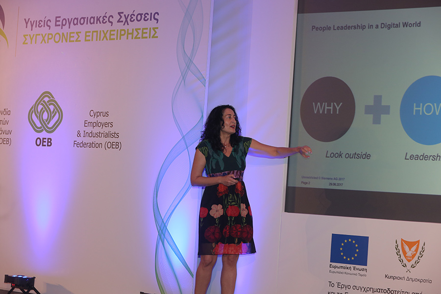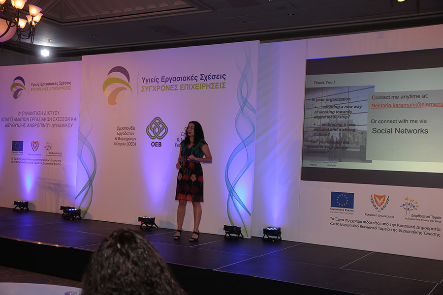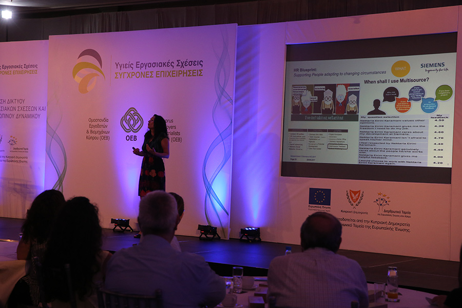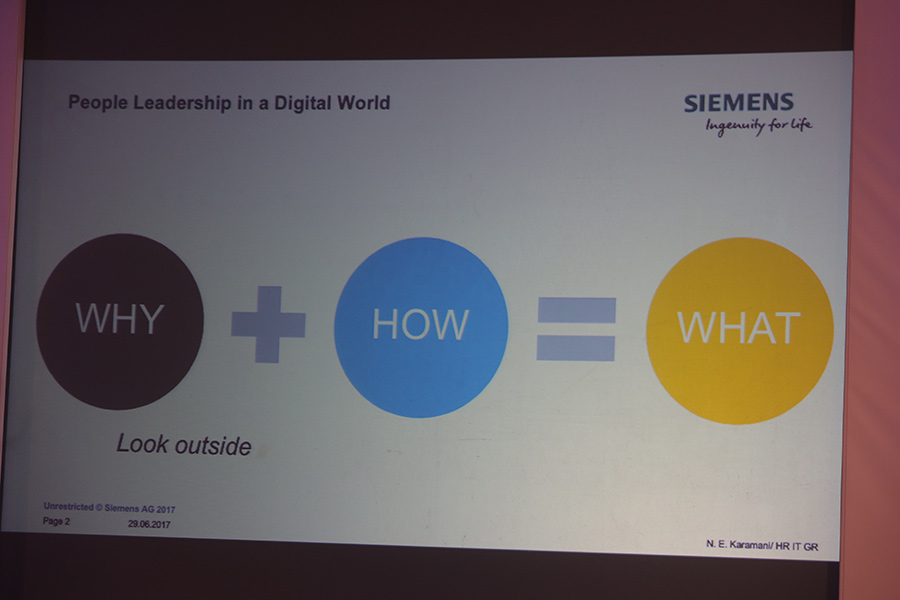 Η συνάντηση συνέχισε με την παρουσίαση της κυρίας Ειρήνης Νεκταρίας Καραμανή, HR Manager της Siemens Ελλάδος. Αναφέροντας ότι η «τέταρτη Βιομηχανική Επανάσταση αφορά την ενδυνάμωση των ανθρώπων και όχι την άνοδο των μηχανών» η κυρία Καραμανή προχώρησε στην παρουσίαση των πρακτικών που εφαρμόζει η Siemens σε εθνικό αλλά και διεθνές επίπεδο για να στηρίξει το ανθρώπινο της δυναμικό να προσαρμοστεί στις συνεχώς μεταβαλλόμενες συνθήκες. Αναπόσπαστο μέρος των πρακτικών, όπως ανέφερε, είναι η επιμονή στο να ενοποιηθούν οι καινοτόμες πρακτικές στην κουλτούρα του οργανισμού μέσα από την αξιοποίηση της τεχνολογίας, ούτως ώστε το ίδιο το ανθρώπινο δυναμικό να επιζητά την ενεργό εμπλοκή του.