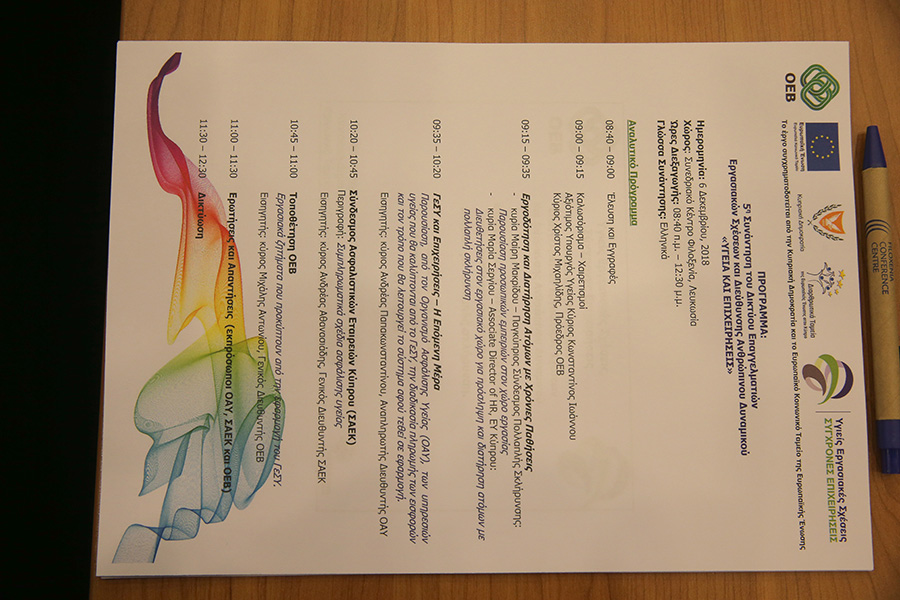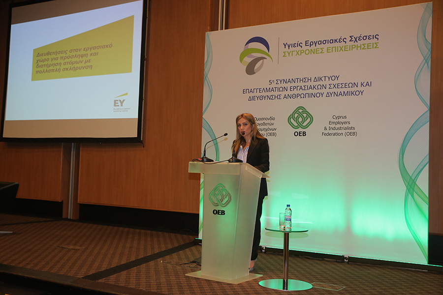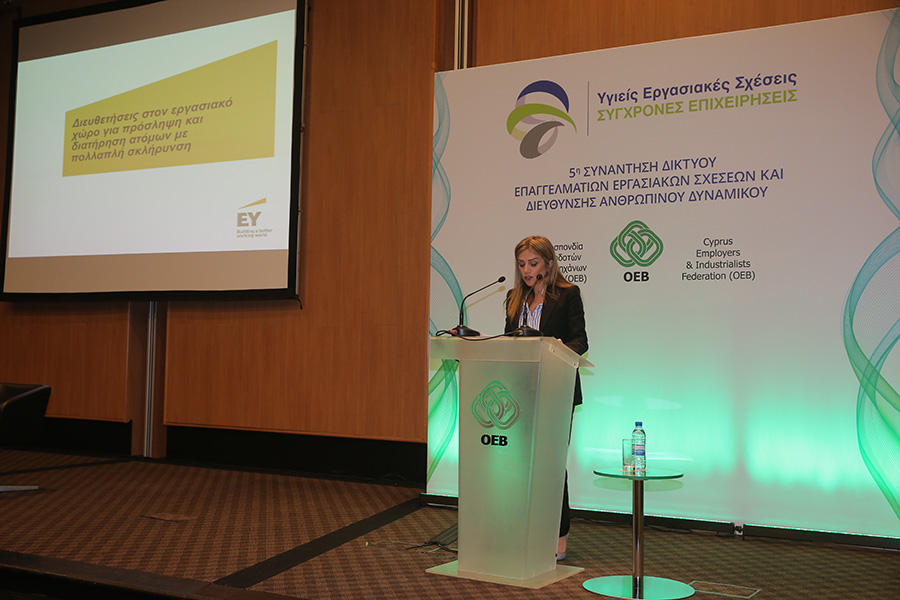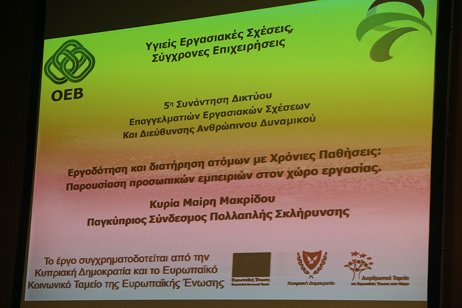 Στο πλαίσιο της εκδήλωσης συζητήθηκε η εργοδότηση και διατήρηση ατόμων με χρόνιες παθήσεις θέμα για το οποίο παρέθεσε τις δικές της προσωπικές εμπειρίες η Μαίρη Μακρίδου, εκ μέρους του Παγκύπριου Συνδέσμου Πολλαπλής Σκλήρυνσης, ενώ η Μαρία Σεργίου Associate Director of HR στην EY Κύπρου αναφέρθηκε στις διευθετήσεις που θα πρέπει να γίνονται στον εργασιακό χώρο για πρόσληψη και διατήρηση ατόμων με πολλαπλή σκλήρυνση.